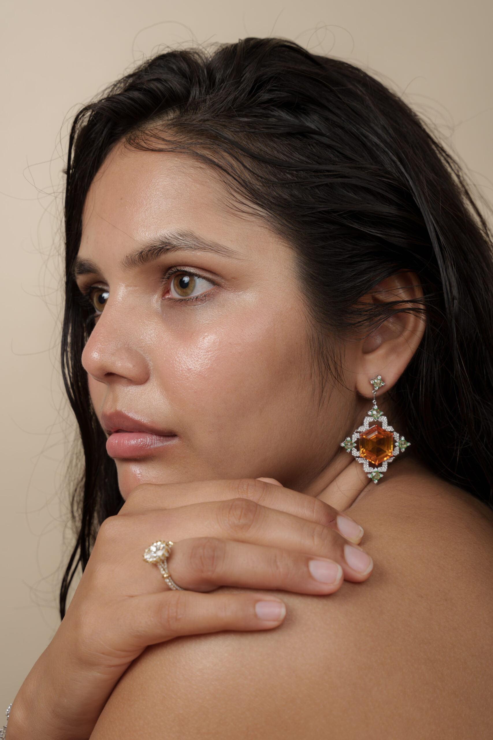 The mandarine stone at the center holds that feeling. The same glow as those afternoons. The same knowing—she was heard before she even knew what she was saying. She wears it to remember. That shaped everything.